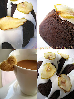 It is ultra moist and it stays that way for days. The secret is sour cream! YES, SOUR CREAM! The recipe was adopted from this book. I think it should be on all kitchen shelf simply because it is useful if you are always on the run and don't have the time to sit there and measure things. I experimented the recipe with different ingredients as I get bored baking the same thing over and over again. I got the recipes for the glaze and pear chip from one of my all time favorite books. For variations, drizzle the cake with different type of sauces and pair with different toppings: chocolate ganache, caramel sauce, chocolate covered strawberries, mixed wild berries, ice cream, just to name a few. Be creative and make your own combo!